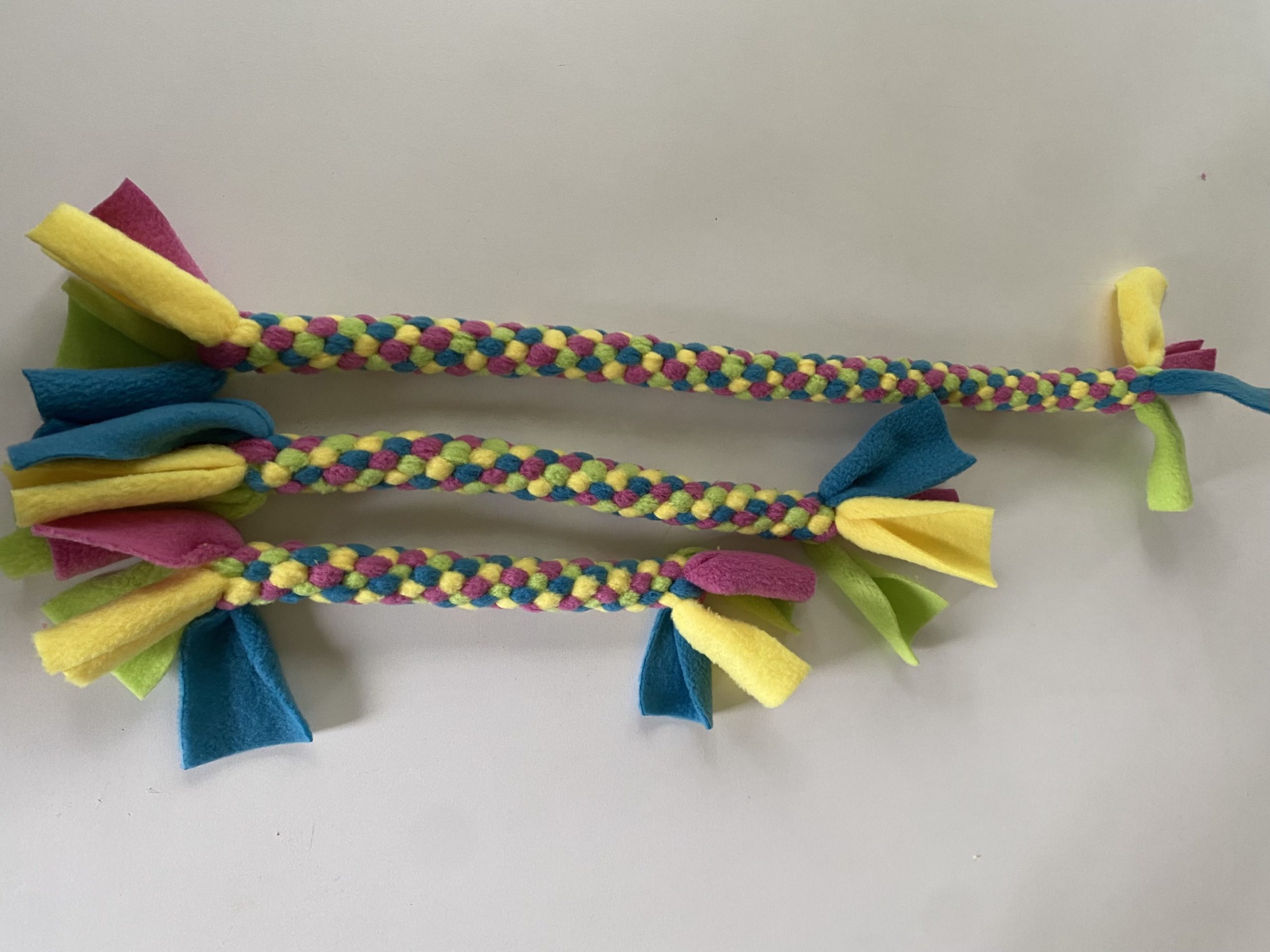 Onze fleece speeltouwen zijn HET speeltje voor je hond! En onmisbaar. ideaal voor trek- en speelspelletjes met je hond. Omdat de speeltjes van fleece gemaakt zijn, is het sterk genoeg voor trekspelletjes. En wat vind je hond naast snuffelen nou leuker? Yes, samen spelen met zijn baas. Speeltje + hond = blije hond!